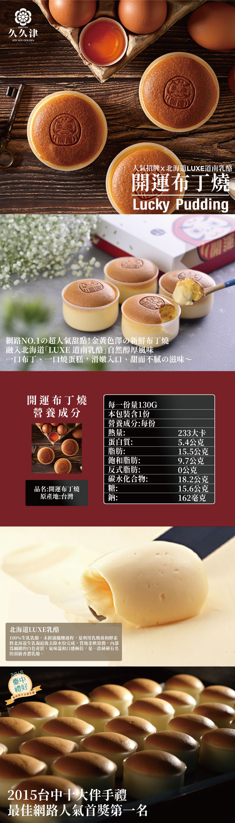 久久津NO.1網路人氣商品金黃色澤の新鮮手工布丁燒融入北海道「LUXE道南乳酪」自然醇厚風味,一口布丁、一口燒蛋糕滑順入口,給您甜而不膩的滋味。